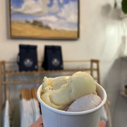 We stopped by here while on a road trip through Wine Country after trying the Santa Rosa location a few years ago. The line moves slowly because of a lot of sampling and flavor indecision from other customers. We got the Raspberry Blood Orange and Passion Fruit ice cream, and a slice of the Dutch Apple Crumble. Raspberry Blood Orange and Passion Fruit icecream (5/5): The raspberry blood orange tastes like a nostalgic orange cream soda in icecream form with a refreshingly bright splash of raspberry. The smooth, creamy, and icy texture is perfect. The Passion Fruit is dairy free but you wouldn't know it, as it doesn't have a hint of coconut or cashew taste. Dutch Apple Crumble (6/5): My goodness this is one of the best apple pies I've ever had!! The thin crust has an immaculate level of doughiness that acts as a vehicle for the apple filling, which isn't too sweet and exhibits mouth-watering notes of fresh cinnamon and brown sugar. The crispy crumbles on top bring the textural satisfaction to the next level, with each bite involuntarily triggering a toe-curling reaction of deliciousness!! Our only regret is not buying an entire pie. We are already seriously contemplating driving two hours from the South Bay to get more pies! I have to take a star off for the service, however. The lady who helped us get our ice cream had on a huge stink face, and was cold and unwelcoming.